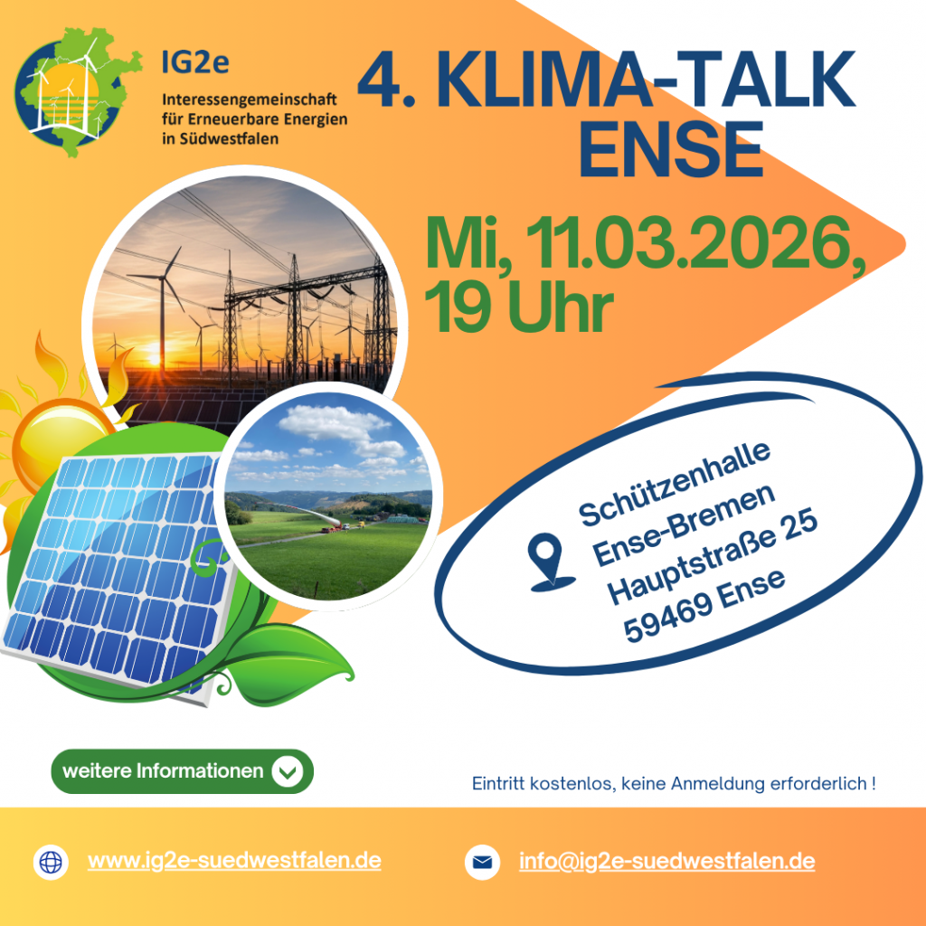Auch im nächsten Jahr freuen wir uns sehr den nunmehr 4. Klima-Talk in Ense durchzuführen. Am 11. März 2026 laden wir herzlich in die Schützenhalle Ense-Bremen ein. 🌍👋